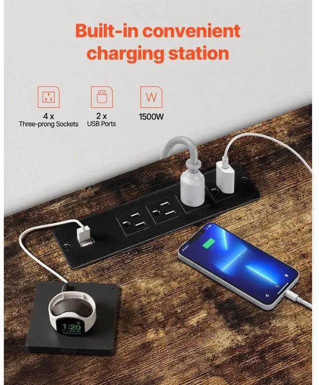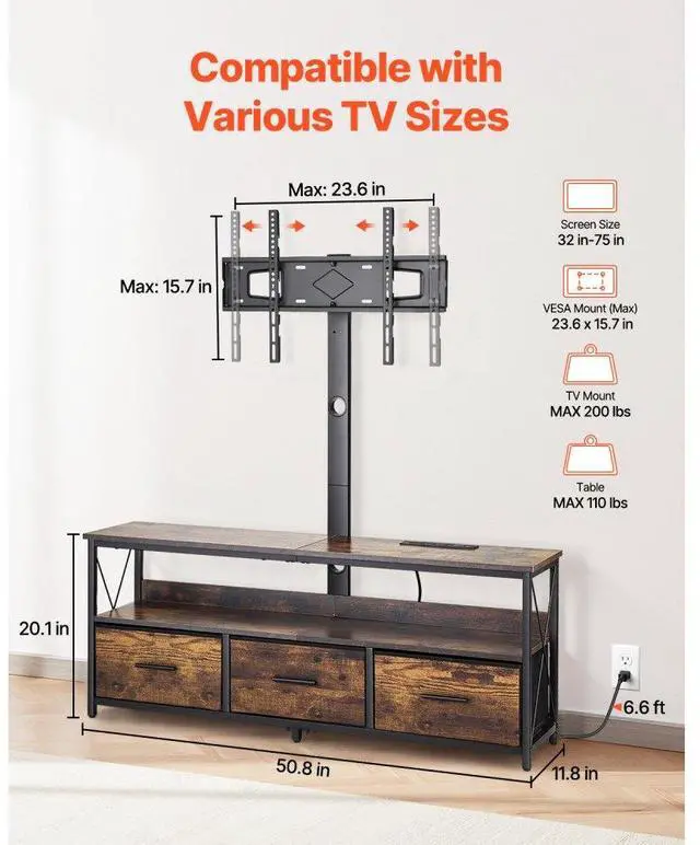 TV Cabinet Weight Capacity: 110 lbs / 49.9 kg,Storage Shelves: 3 Tiers,Socket Ports: 4 x three-prong Outlets + 2 x USB Ports,Power Strip Wattage: 1500W,Color: Brown,Material: Carbon Steel + Particle Board,Compatible TV Size: 32-75 inches / 810-1900 mm,Product Dimensions: 50.8 x 11.8 x 20.1 in / 1290 x 300 x 510 mm,Stand Weight Capacity: 200 lbs / 90.7 kg,Light Tube: 2 x Magnetic Light Tubes,VESA Mount (Max): 23.6 x 15.7 in / 600 x 400 mm,Item Model Number: C240413S-01,Strip Light: 16 Colors LED Strip Light ,Cable Length: 6.6 ft / 2 m,Net Weight: 44.01 lbs / 20 kg