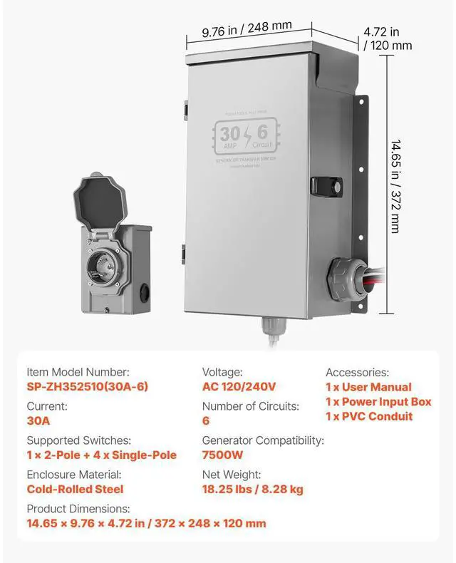 Generator Compatibility: 7500W,Voltage: AC 120/240V,Item Model Number: SP-ZH352510(30A-6),Enclosure Material: Cold-Rolled Steel,Supported Switches: 1 x 2-Pole + 4 x Single-Pole,Number of Circuits: 6,Product Dimensions: 14.65 x 9.76 x 4.72 in / 372 x 248 x 120 mm,Current: 30A,Net Weight: 18.25 lbs / 8.28 kg