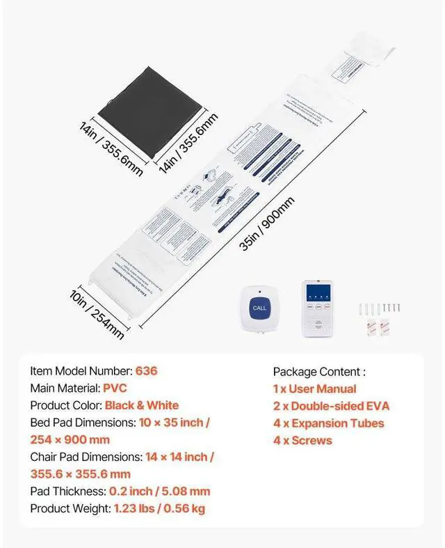 Bed Pad Dimensions: 10 x 35 inch / 254 x 889 mm,Product Color: Black & White,Item Model Number: 636,Product Weight: 1.23 lbs / 0.56 kg,Main Material: PVC,Chair Pad Dimensions: 14 x 14 inch / 355.6 x 355.6 mm,Pad Thickness: 0.2 inch / 5.08 mm