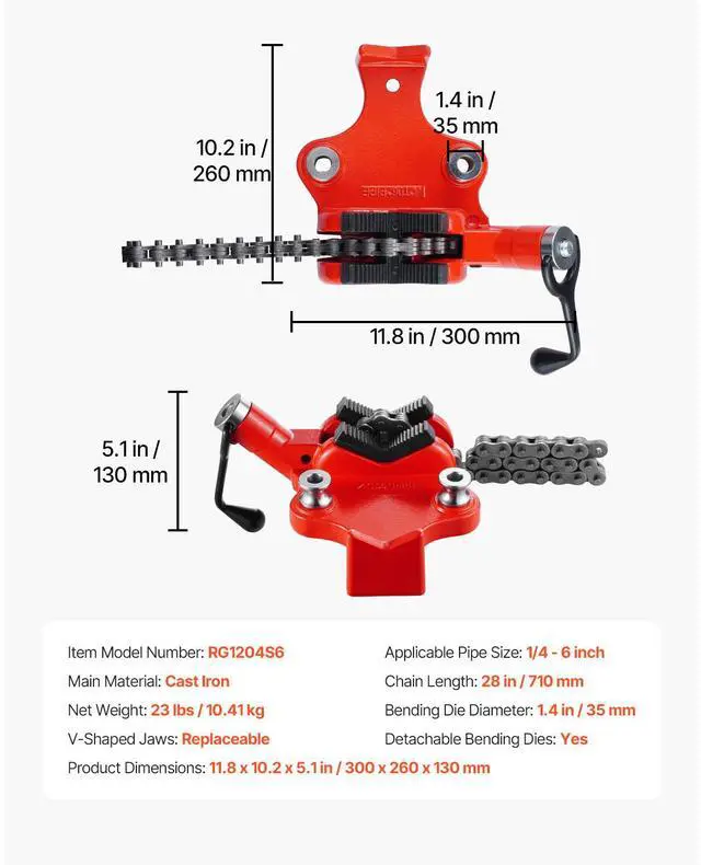 V-Shaped Jaws: Replaceable,Detachable Bending Dies: Yes,Applicable Pipe Size: 1/4 - 6 inch,Item Model Number: RG1204S6,Product Dimensions: 11.8 x 10.2 x 5.1 in / 300 x 260 x 130 mm,Chain Length: 28 in / 710 mm,Net Weight: 23 lbs / 10.41 kg,Main Material: Cast Iron