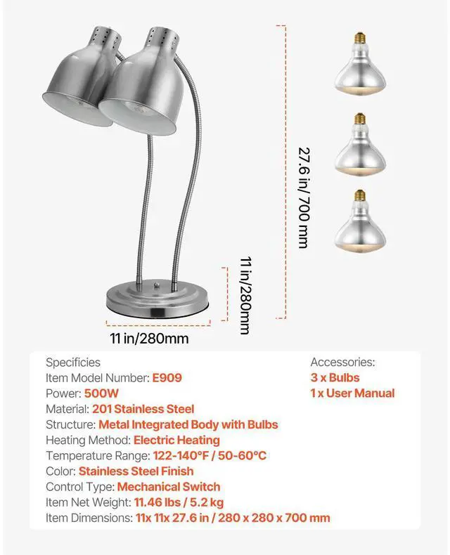 Control Type: Mechanical Switch,Color: Stainless Steel Finish,Item Model Number: E909,Material: 201 Stainless Steel,Heating Method: Electric Heating,Item Net Weight: 11.46 lbs / 5.2 kg,Item Dimensions: 11 x 11 x 27.6 in / 280 x 280 x 700 mm,Structure: Metal Integrated Body with Bulbs,Power: 500W