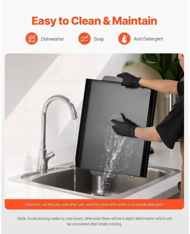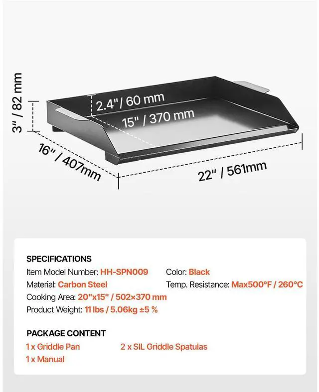 Temp. Resistance: Max500°F / 260°C,Color: Black,Item Model Number: HH-SPN009,Product Weight: 11 lbs / 5.06 kg ±5 %,Material: Carbon Steel,Cooking Area: 20"x15" / 502x370 mm