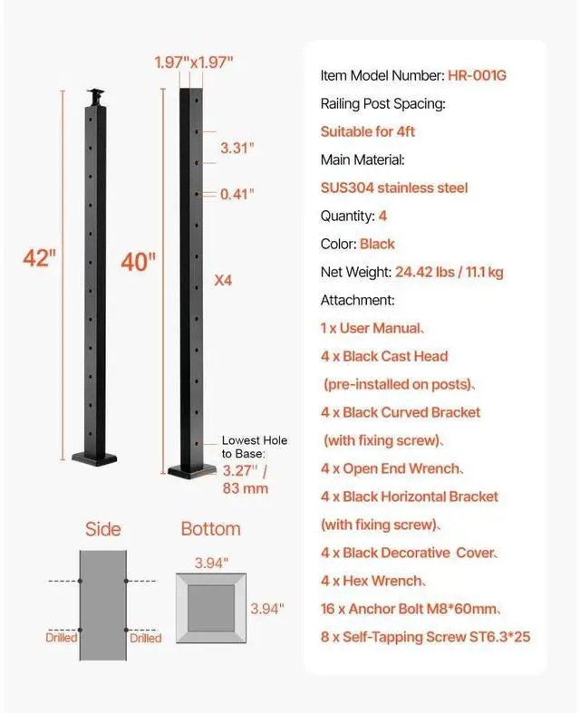 Number of Holes: 12,Net Weight(Include Accessories): 24.47 Ibs /11.1kg (±3%),Color: Black,Item Model Number: HR-001,Quantity: 4,Railing Post Spacing: Suitable for up to 4ft,Main Material: SUS304 Stainless Steel