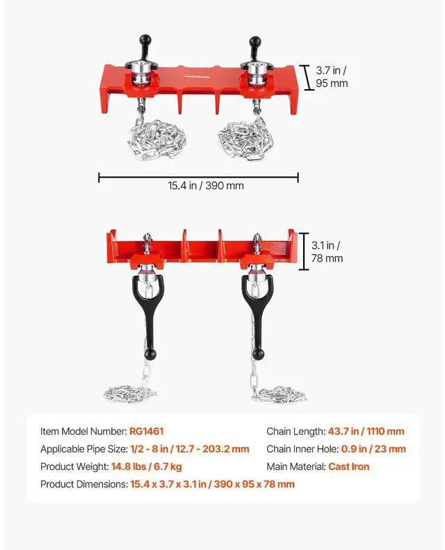 Applicable Pipe Size: 1/2 - 8 in / 12.7 - 203.2 mm,Item Model Number: RG1461,Product Weight: 14.8 lbs / 6.7 kg,Product Dimensions: 15.4 x 3.7 x 3.1 in / 390 x 95 x 78 mm,Chain Length: 43.7 in / 1110 mm,Main Material: Cast Iron