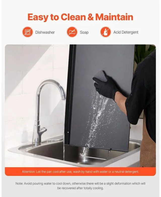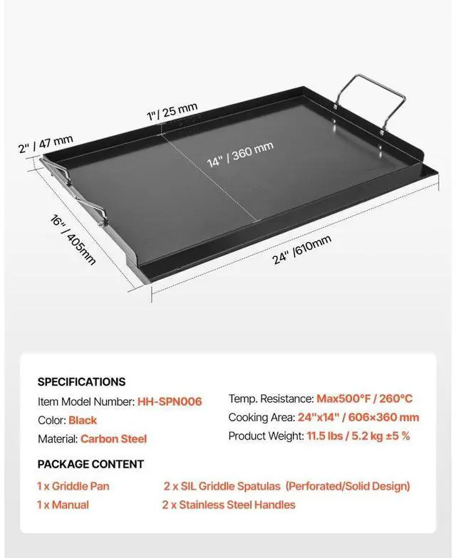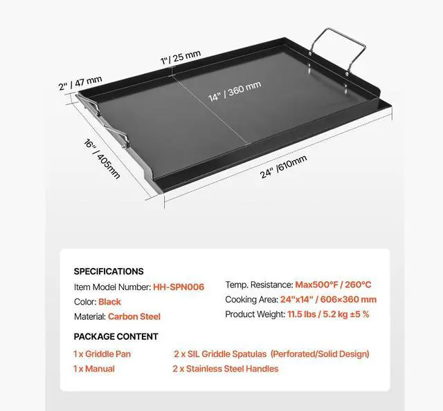 Temp. Resistance: Max500°F / 260°C,Color: Black,Item Model Number: HH-SPN006,Product Weight: 11.5 lbs / 5.2 kg ±5 %,Material: Carbon Steel,Cooking Area: 24"x14" / 606x360 mm