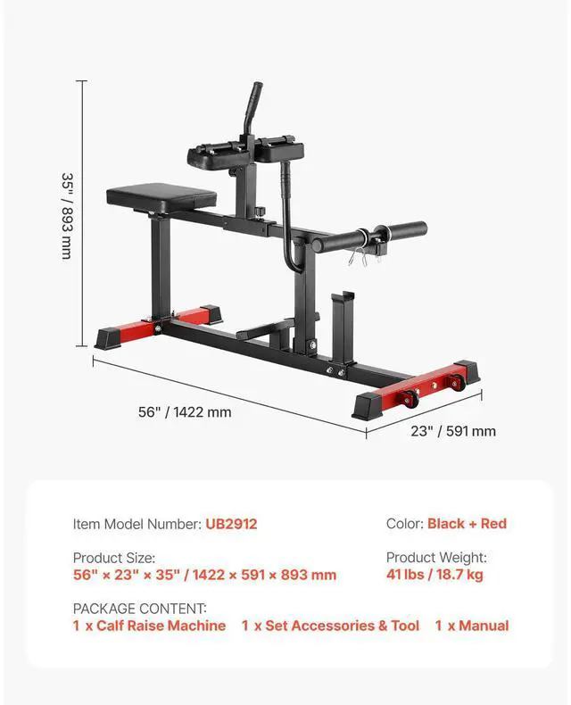 Thigh Pad Size: 8 x5 x2 inch / 200 x120 x50 mm ,Color: Black + Red ,Item Model Number: UB2912 ,Product Weight: 41 lbs / 18.7 kg±3%,Material: Carbon Steel ,Handle Height Adjustment: 5 Levels (1in / level) ,Cushion Size: 13 x10 x2 inch / 330 x265 x50 mm ,Handle Horizonal Position Adjustment: 4 Levels (1in / level) ,Product Size: 56 x35 x23 inch / 1422 x893 x591 mm