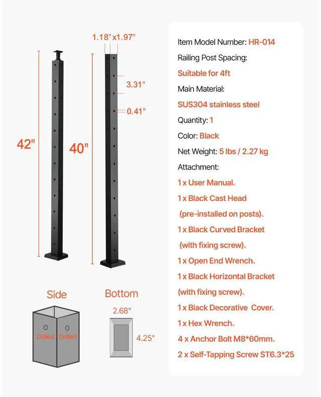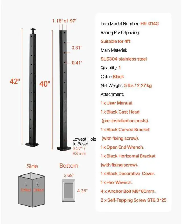 Number of Holes: 12,Net Weight(Include Accessories): 5 lbs/2.27kg (±3%),Color: Black,Item Model Number: HR-014,Quantity: 1,Railing Post Spacing: Suitable for up to 4ft,Main Material: SUS304 Stainless Steel