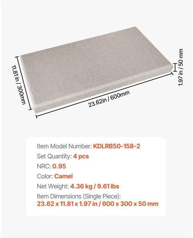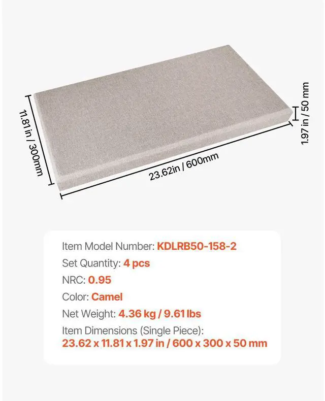 Set Quantity: 4 pcs,Color: Camel,Item Model Number: KDLRB50-158-2,Item Dimensions (Single Piece): 600 x 300 x 50 mm / 23.62 x 11.81 x 1.97 inches,Net Weight: 4.36 kg / 9.61 lbs,NRC: 0.95,Main Material: 100% White Fiberglass Liner,Back Adhesive: 3M, Self-adhesive