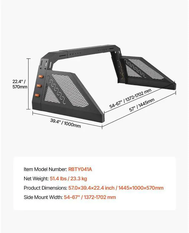 Side Mount Width: 54-67 inch / 1372-1702 mm,Item Model Number: RBTY041A,Item Dimensions: 23.4 x 16.3 x 73.0 inch / 595 x 415 x 1855 mm,Net Weight: 51.4 lbs / 23.3 kg,Main Material: Carbon Steel