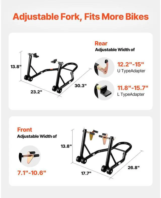 Item Model Number: TD-003-05WFR,Net Weight: 21.4 lbs/9.7 kg (Include all accessories),Adapter Types: Front Wheel: Double Fork Heads. Rear Wheel: U +L Fork Head,Item Dimensions(Rear Stand): 30.3 x 23.2 x 13.8 inch/770 x 590 x 350 mm