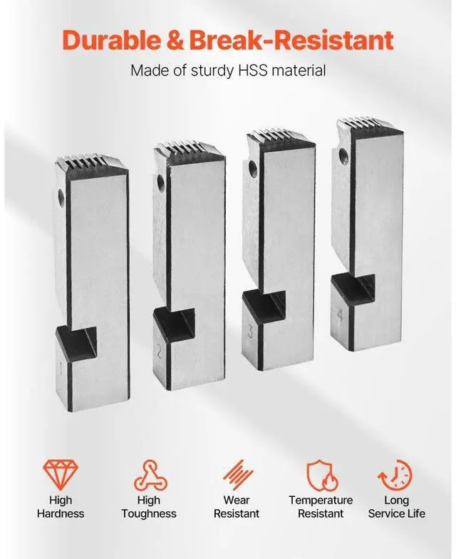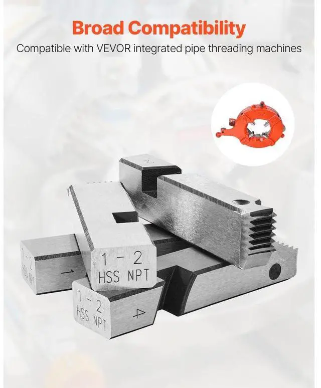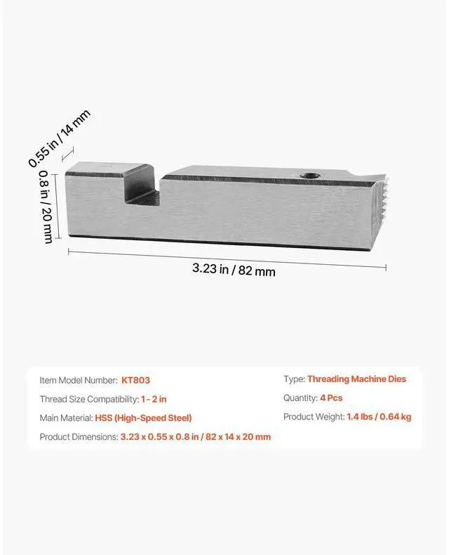 Type: Threading Machine Dies,Thread Size Compatibility: 1 - 2 in,Item Model Number: KT803,Product Weight: 1.4 lbs / 0.64 kg,Quantity: 4 Pcs,Product Dimensions: 3.23 x 0.55 x 0.8" / 82 x 14 x 20 mm,Main Material: HSS (High-Speed Steel)