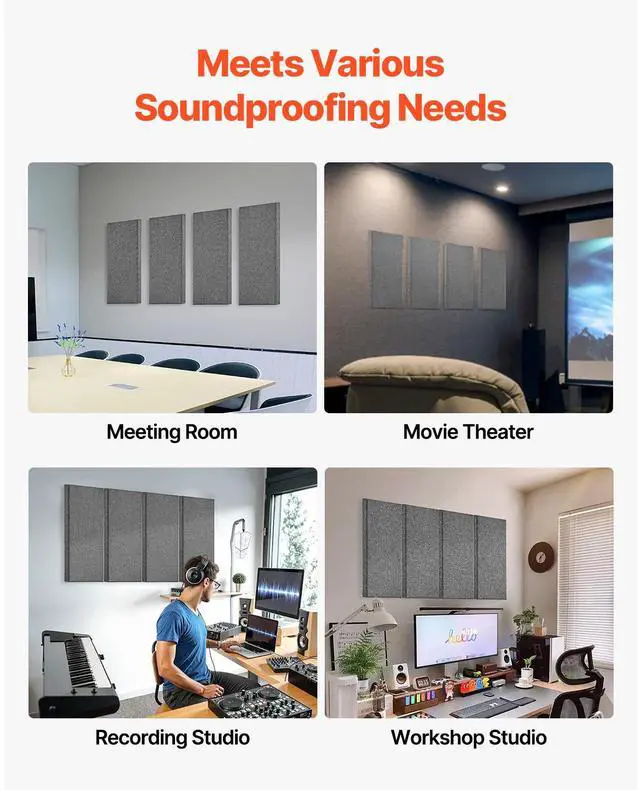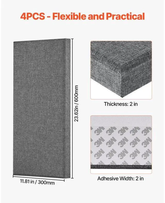 4 PCS Acoustic Wall Panels 2 in Thick 23.6 x 11.8 in Self-adhesive Gray