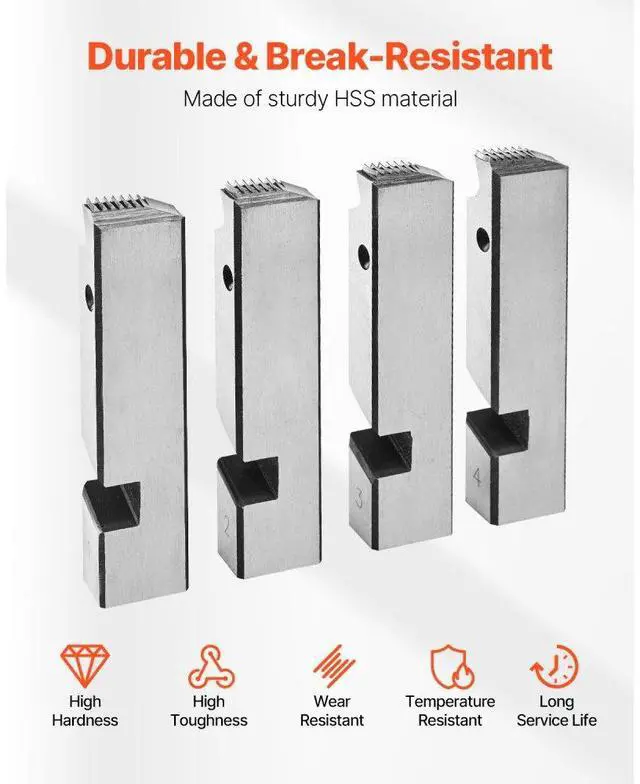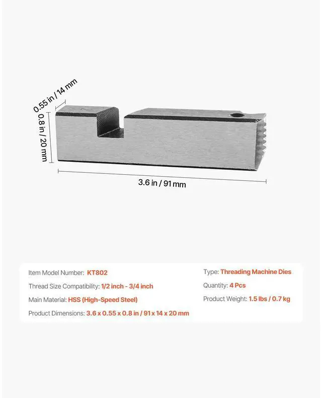 Type: Threading Machine Dies,Thread Size Compatibility: 1/2 inch - 3/4 inch,Item Model Number: KT802,Product Weight: 1.5 lbs / 0.7 kg,Quantity: 4 Pcs,Product Dimensions: 3.3 x 0.55 x 0.8" / 84 x 14 x 20 mm,Main Material: HSS (High-Speed Steel)