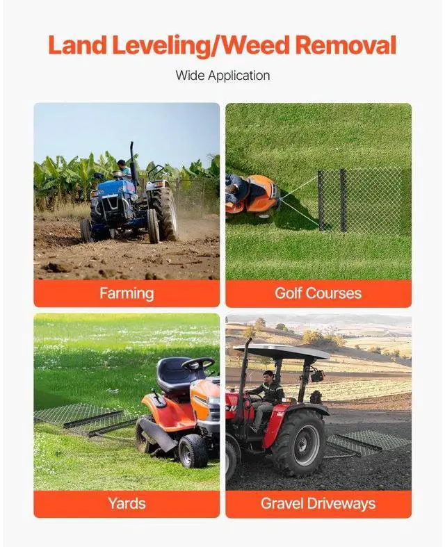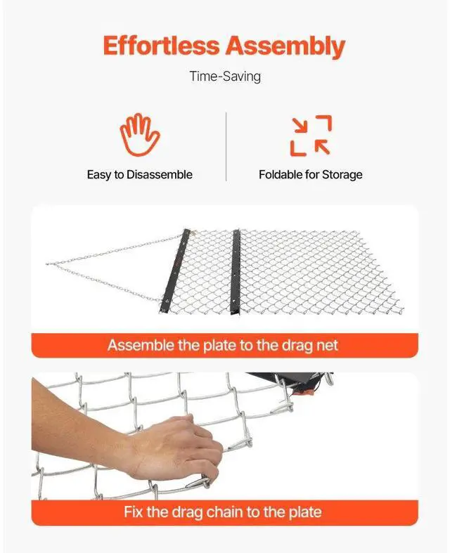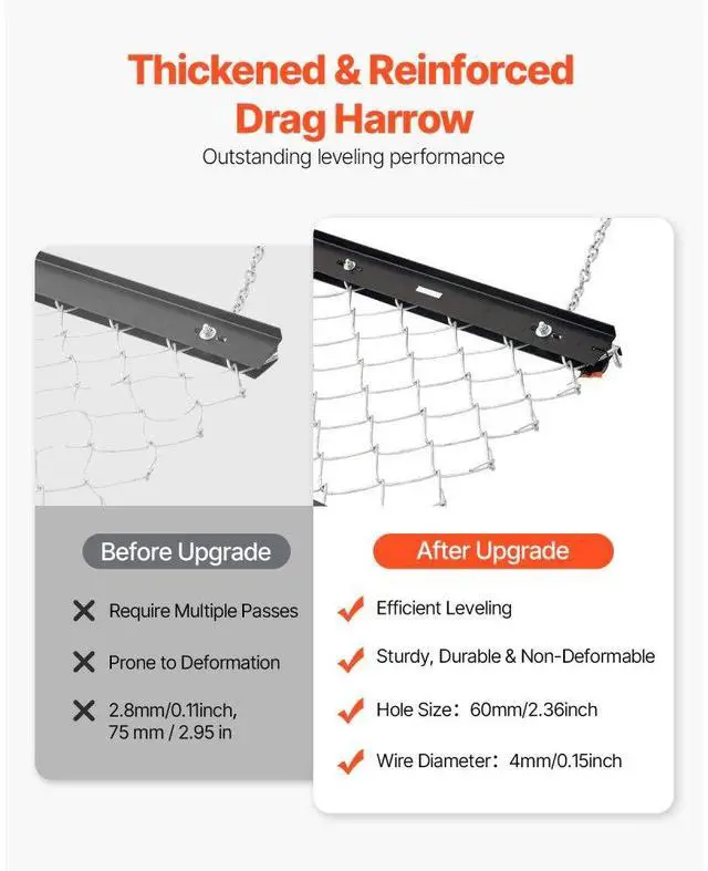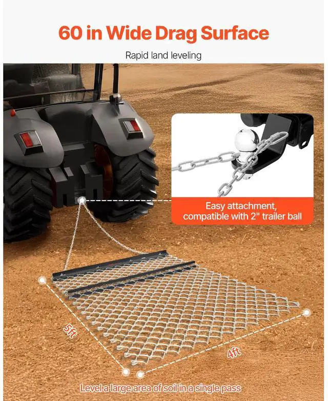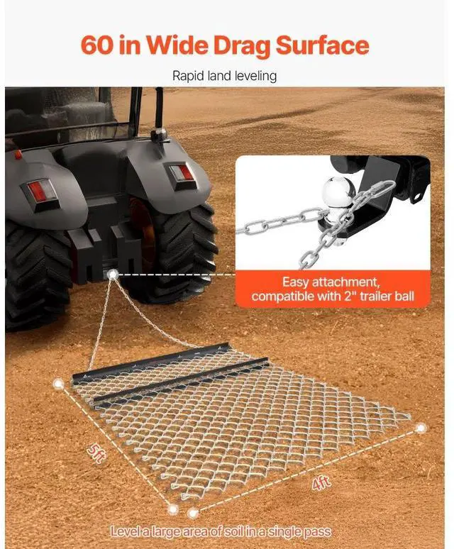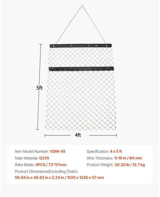 Rake Blade: 4PCS / T2*57mm,Item Model Number: VDM-45,Product Weight: 30.20 lb / 13.7 kg,Specification: 4 x 5 ft,Product Dimensions(Excluding Chain): 59.84 in x 48.82 in x 2.24 in / 1520 x 1240 x 57 mm,Wire Thickness: 0.16 in / Ø4 mm,Main Material: Q235