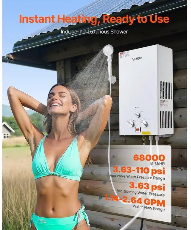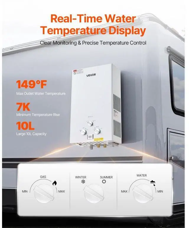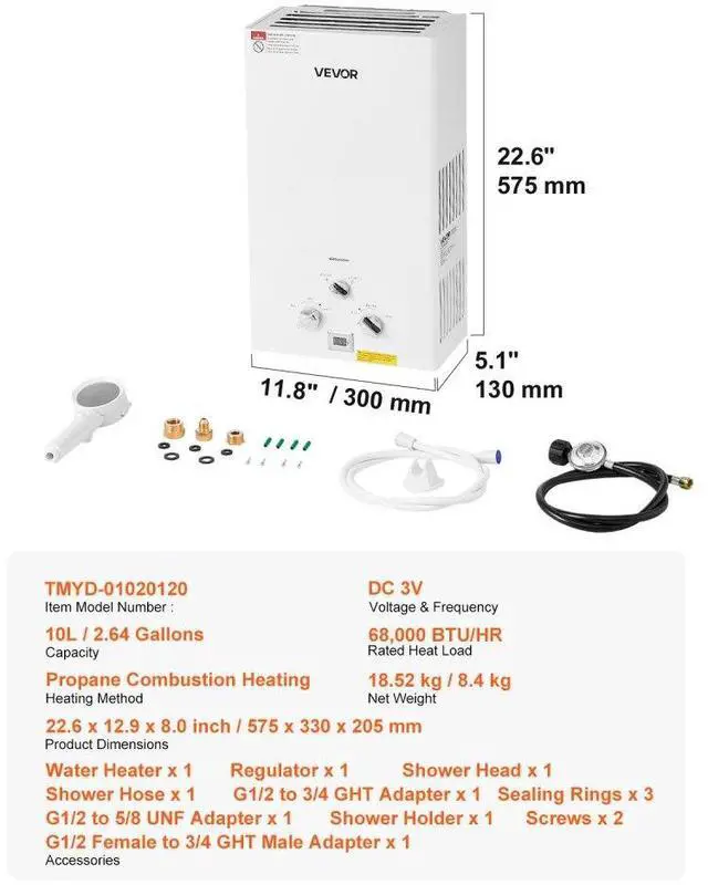 Applicable Water Pressure Range: 3.63-110 psi,Water Flow Range: 1.14-2.64 GPM,Capacity: 10L / 2.64 Gallons,Color: White,Temperature Display: LED,Item Model Number: TMYD-01020120,Heating Method: Propane Combustion Heating,Voltage & Frequency: DC 3V,Rated Heat Load: 68,000 BTU/HR,Product Dimensions: 22.6 x 12.9 x 8.0 inch / 575 x 330 x 205 mm,Net Weight: 18.52 kg / 8.4 kg,Main Material: Iron Q235B + Copper