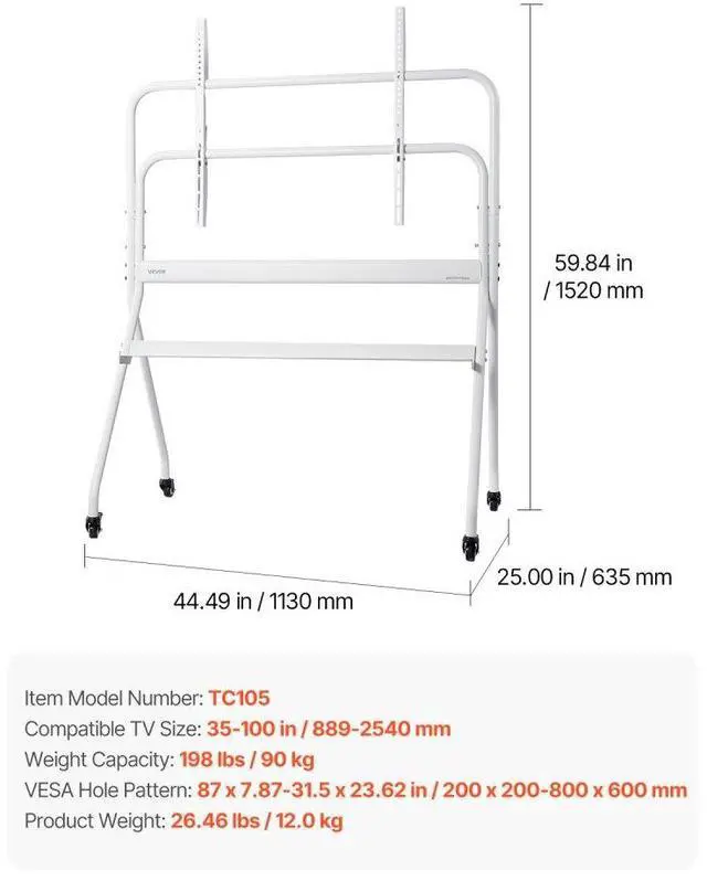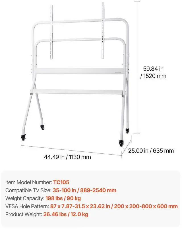 Weight Capacity: 198 lbs / 90 kg,Item Model Number: TC105,Product Weight: 26.46 lbs / 12.0 kg,Compatible TV Size: 35-100 in / 889-2540 mm,VESA Hole Pattern: 87 x 7.87-31.5 x 23.62 in / 200 x 200-800 x 600 mm,Product Dimensions: 44.49 x 25.00 x 59.84 in / 1130 x 635 x 1520 mm