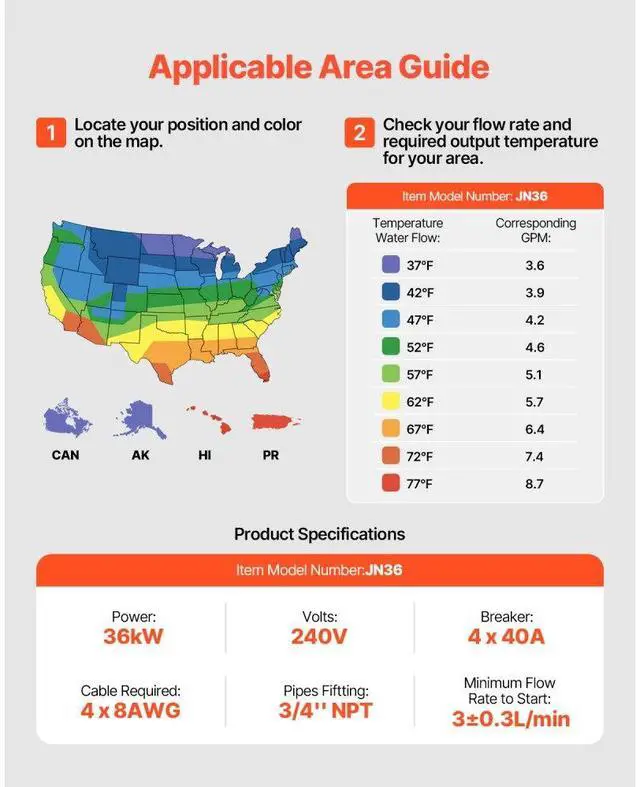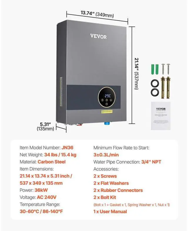 Voltage: AC 250V,Item Model Number: JN36,Water Pipe Connection: 3/4" NPT,Temperature Range: 30-60 / 86-140,Item Dimensions: 20.1 x 13.66 x 5.31 inch / 510 x 347 x 135 mm,Minimum Flow Rate to Start: 3±0.3L/min,Net Weight: 34 lbs / 15.4 kg,Main Material: Carbon Steel,Power: 36kW