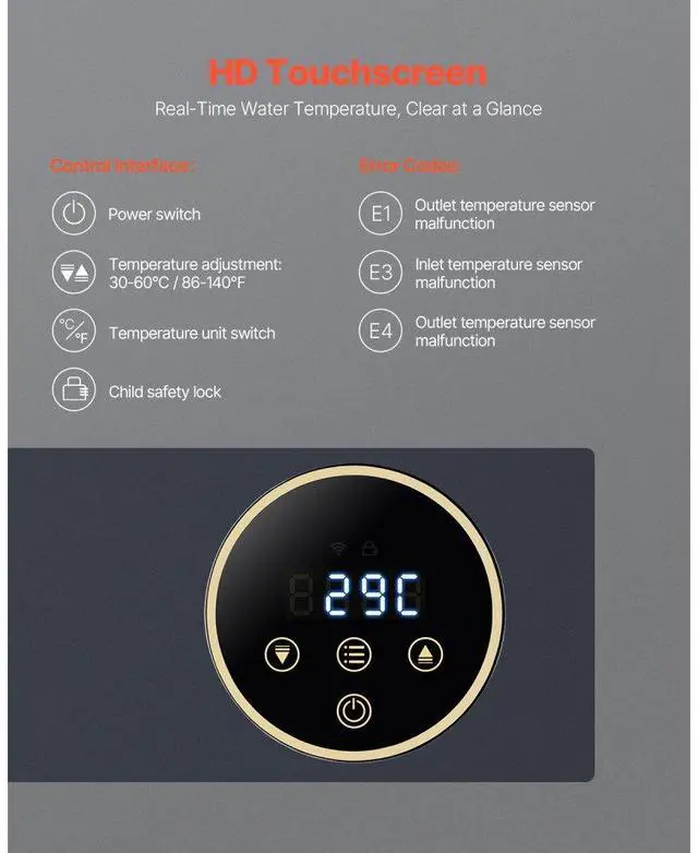 36kW Tankless Electric Water Heater Instant Hot with LCD Touch Child Lock