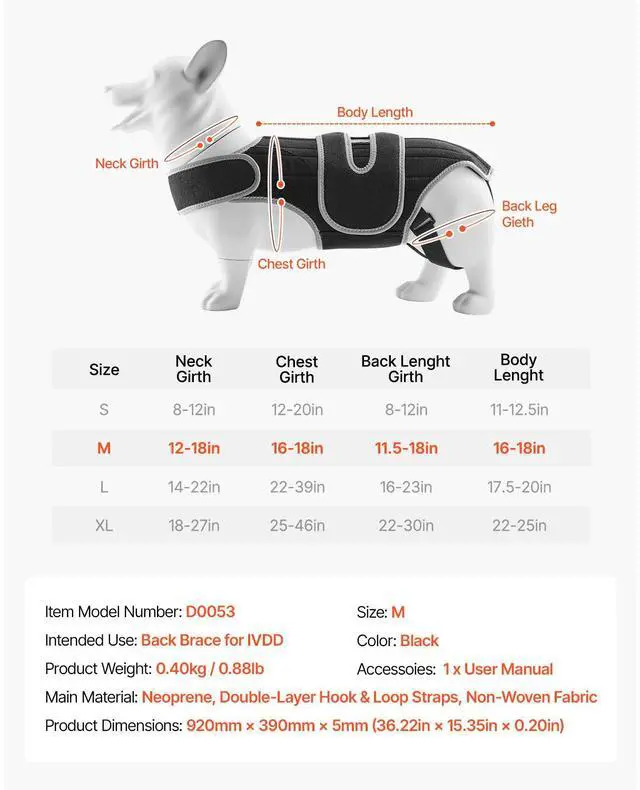• VEVOR Dog Back Brace Adjustable Dog Spine Support Harness for IVDD After-Surgery