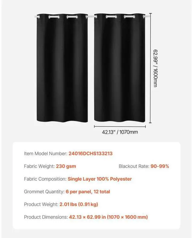 Fabric Composition: Single Layer 100% Polyester,Fabric Weight: 230 gsm,Item Model Number: 24016DCHS133213,Blackout Rate: 90-99%,Product Weight: 2.01 lbs / 0.91 kg,Grommet Quantity: 6 per panel, 12 total,Product Dimensions: 42.13 x 62.99 in / 1070 x 1600 mm