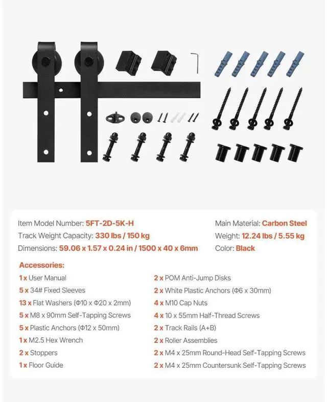 Track Weight Capacity: 330 lbs / 150 kg,Color: Black,Item Model Number: 5FT-2D-5K-H,Dimensions: 59.06 x 1.57 x 0.24 in / 1500 x 40 x 6 mm,Main Material: Carbon Steel,Weight: 12.24 lbs / 5.55 kg