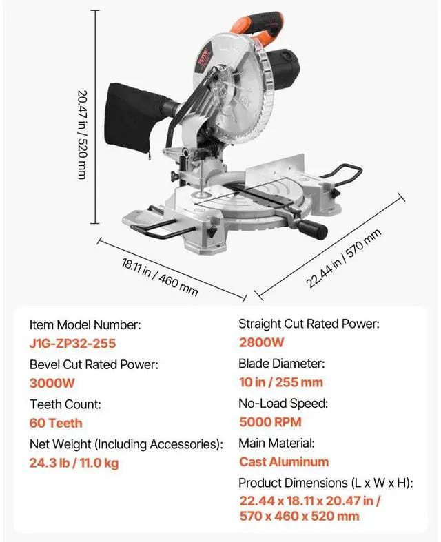 Blade Diameter: 10 in / 255 mm,Net Weight (Including Accessories): 24.3 lb / 11.0 kg,Straight Cut Rated Power: 2800W,Bevel Cut Rated Power: 3000W,Teeth Count: 60 Teeth,Item Model Number: J1G-ZP32-255,No-Load Speed: 5000 RPM,Product Dimensions (L x W x H): 22.44 x 18.11 x 20.47 in / 570 x 460 x 520 mm,Main Material: Cast Aluminum