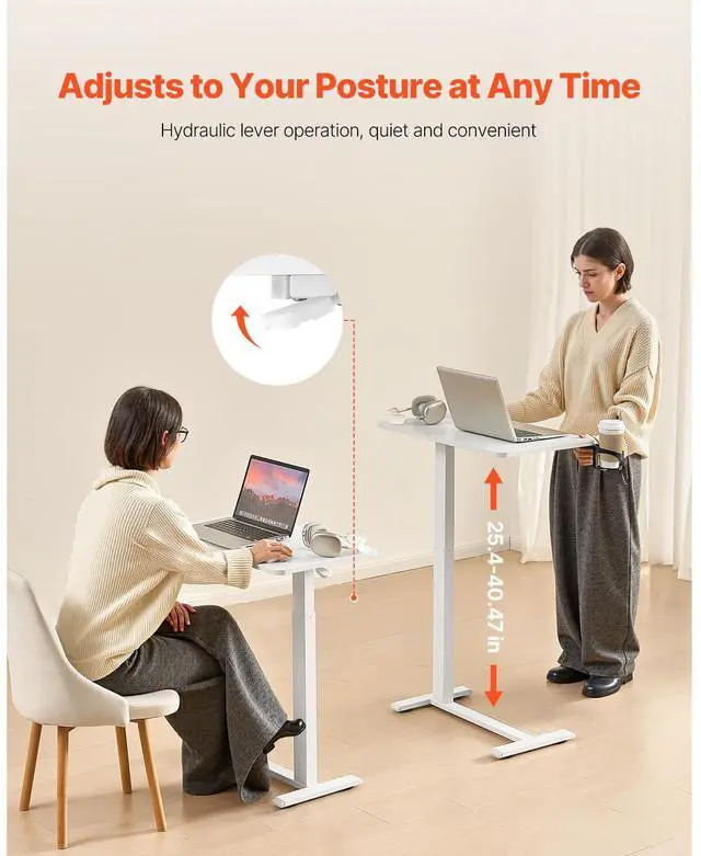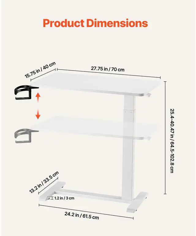 Adjustable Height: With a smooth hydraulic system, this overbed table adjusts from 25.4 in / 64.5 cm to 40.47 in / 102.8 cm ideal for sitting and standing. Plus, the tabletop tilts 0-60°, making it ideal for reading, working, or drawing.