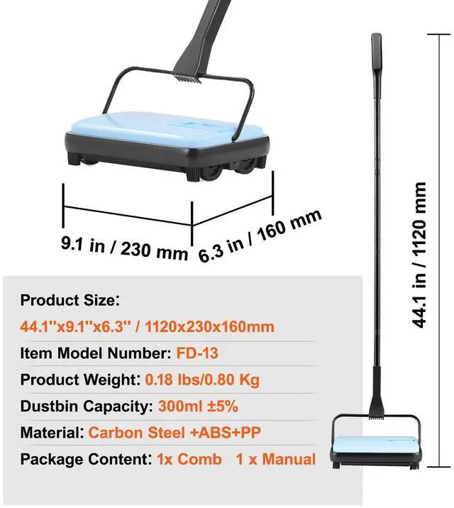 Edge Brush Material: PVC,Sweeping Paths: 7.87 in/200 mm,Dustbin Capacity: 300 ml ±5%,Item Size: 44.1 x 9.1 x 6.3 inch / 1120 x 230 x 160 mm,Main Brush Material: Wire + PP,Item Model Number: FD-13,Net Weight: 0.18 lbs / 0.8 kg,Main Material: Carbon Steel + ABS + PP,Wheel Material: PP+TRP