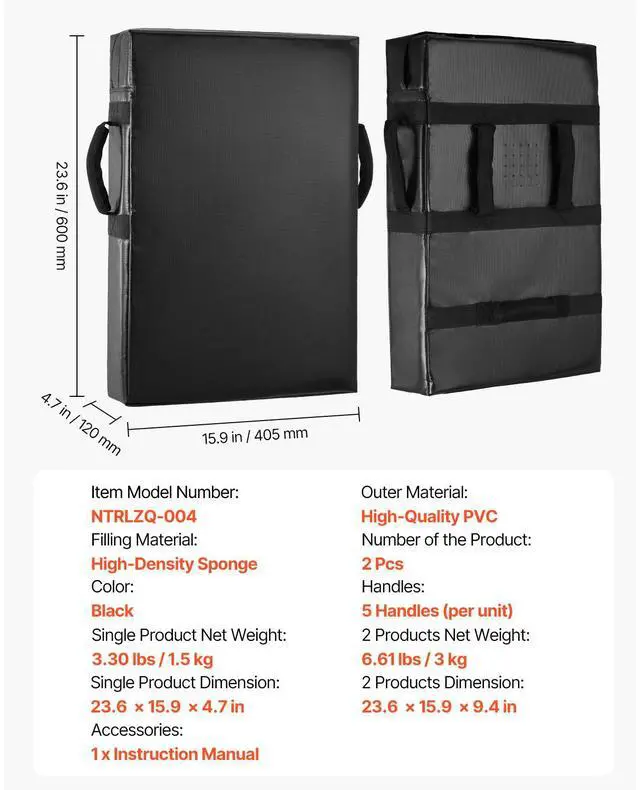 Outer Material: High-Quality PVC,Color: Black,Item Model Number: NTRLZQ-004,Single Product Net Weight: 3.3 lbs / 1.5 kg,Filling Material: High-Density Sponge,Single Product Dimension: 23.6 x 15.9 x 4.7 in / 600 x 405 x 120 mm,Number of the Product: 2 pcs,2 Products Net Weight: 6.6 lbs / 3 kg,2 Products Dimension: 23.6 x 15.9 x 9.4 in / 600 x 405 x 240 mm