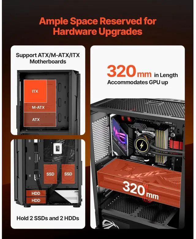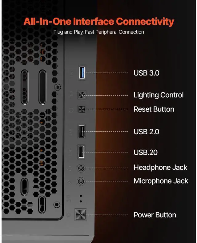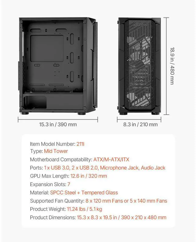 Motherboard Compatibility: ATX/M-ATX/ITX,Type: Mid Tower,Supported Fan Quantity: 8 x 120 mm Fans, 5 x 140 mm Fans,Expansion Slots: 7,GPU Max Length: 12.6 in / 320 mm,Item Model Number: 211I,Ports: 1 x USB 3.0, 2 x USB 2.0, Microphone Jack, Audio Jack,Material: SPCC Steel + Tempered Glass
