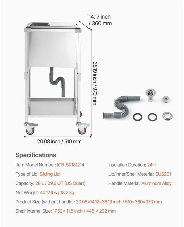 Shelf Internal Size: 19.29 x 13.39 inch / 490 x 340 mm,Lid/Inner/Shell Material: SUS201,Type of Lid: Sliding Lid,Capacity: 28 L / 29.6 QT (US Quart),Item Model Number: ICB-SR181214,Insulation Duration: 24H,Product Size (without handle): 20.08 x 14.17 x 38.19 inch / 510 x 360 x 970 mm,Net Weight: 40.12 lbs / 18.2 kg,Handle Material: Aluminum Alloy