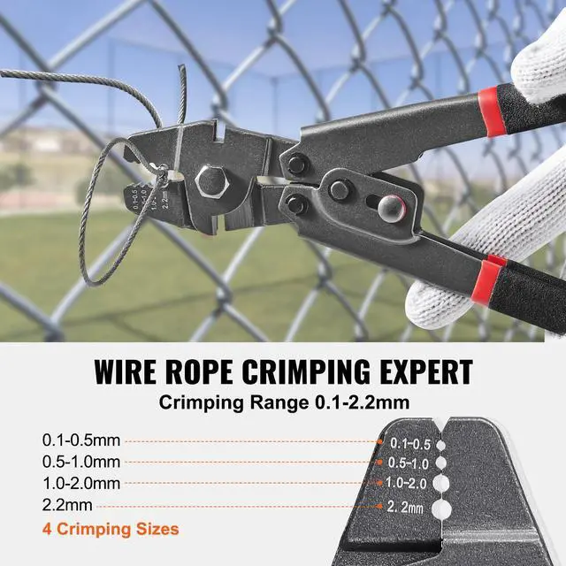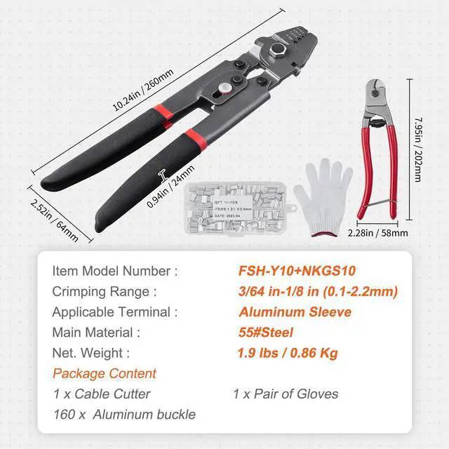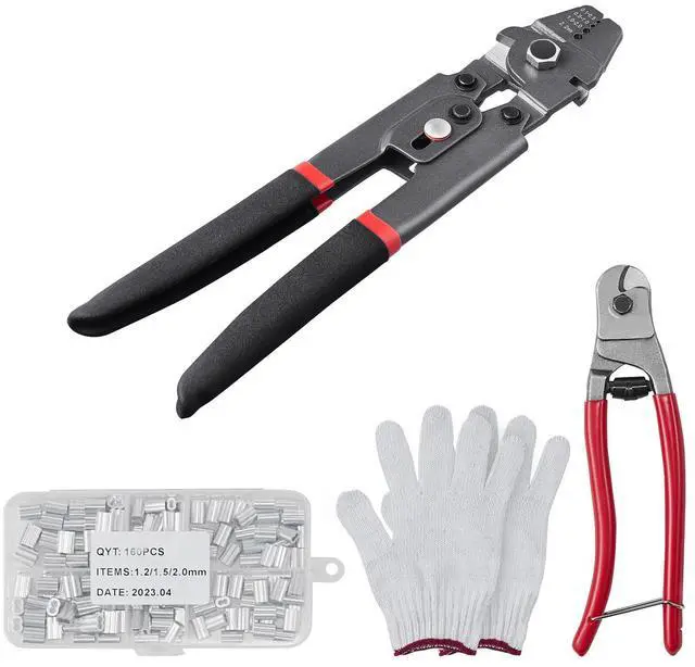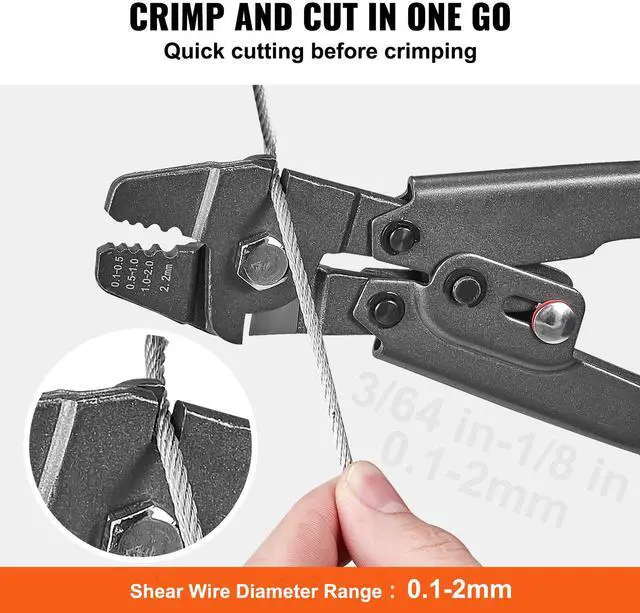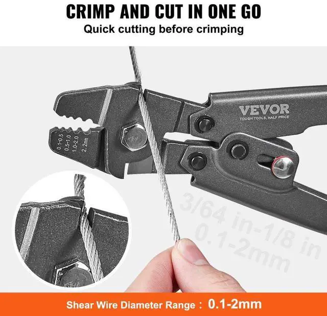VEVOR Wire Rope Crimping Tool and Cutter Up To 2.2 mm Wire Cable Crimps, 1/64" - 3/32" Crimping Loop Sleeve Kit and 160pcs Aluminum Buckles, Fishing Crimping Tool Wire Rope Thimbles Kit Two-in-One Functionality High Hardness Steel Forging Corrosion-Resistant Coating 4-Step Simple Operation Effortless Handle Crimping