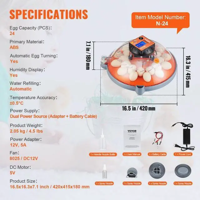 VEVOR Egg Incubator, Incubators for Hatching Eggs, Automatic Egg Turner with Temperature and Humidity Control, 24 Eggs Poultry Hatcher with ABS Transparent Shell for Chicken, Duck, Quail Precision Control Automated Operation Durable ABS Material For Versatile Hatching Dual Power Supply Intelligent Chicken Incubator Primary Material: ABS,
