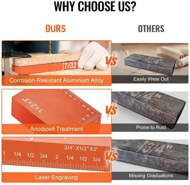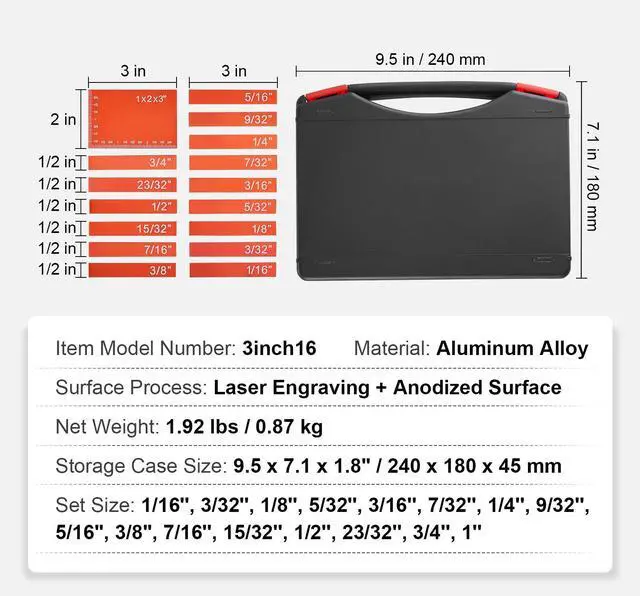 VEVOR Setup Blocks Woodworking Tools, 16-Piece, Precision Height Gauge Block Set, with Clearly Laser Engraved Size Markings and Storage Case, Aluminum Setup Bars for Router and Table Saw Accessories Unparalleled Precision Rugged Aluminum Alloy Construction Clear Scale Markings Secure Storage 100 Measurement Options Vibrant Orange Appearance