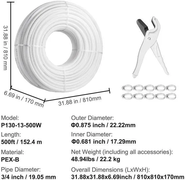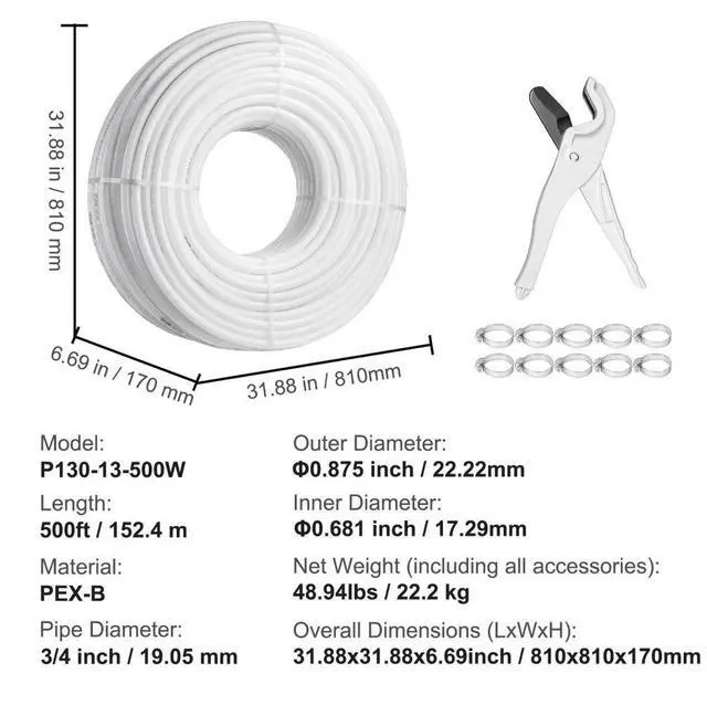 VEVOR PEX Pipe 3/4 Inch, 500 Feet Length PEX-B Flexible Pipe Tubing for Potable Water, Pex Water Lines for Hot/Cold Water & Easily Restore, Plumbing Applications with Free Cutter & Clamps, White PEX-A Pipe vs. PEX-A Pipe Smooth and Rust-Free 4-Step Quick Installation Versatile PEX-B Pipe Smooth Inner Surface Longevity PEX-A pipe offers excellent heat stability and pressure resistance, reducing the likelihood of ruptures and damage. With a lifespan of up to 5 years or more, it eliminates the need for frequent replacements, providing both cost-effectiveness and peace of mind.