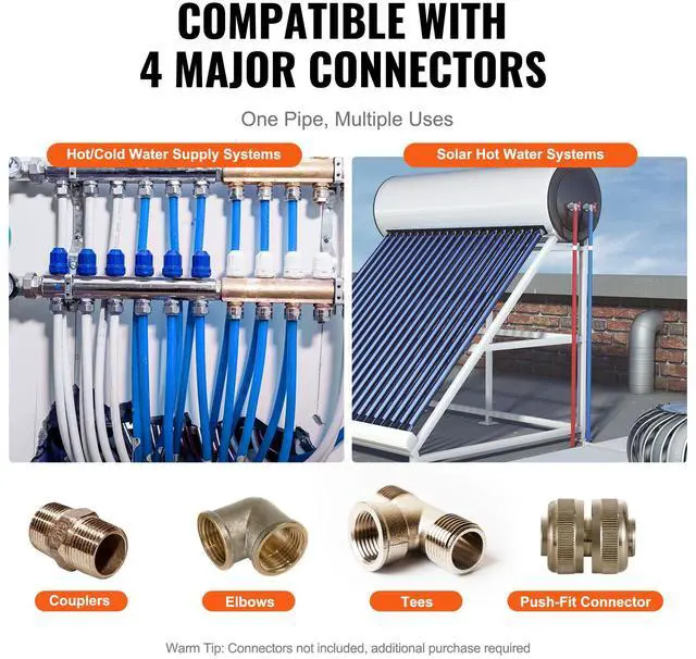 VEVOR PEX Pipe 3/4 Inch, 100 Feet Length PEX-B Flexible Pipe Tubing for Potable Water, Pex Water Lines for Hot/Cold Water & Easily Restore, Plumbing Applications with Free Cutter & Clamps, Blue PEX-A Pipe vs. PEX-A Pipe Smooth and Rust-Free 4-Step Quick Installation Versatile PEX-B Pipe Smooth Inner Surface Longevity PEX-A pipe offers excellent heat stability and pressure resistance, reducing the likelihood of ruptures and damage. With a lifespan of up to 5 years or more, it eliminates the need for frequent replacements, providing both cost-effectiveness and peace of mind.