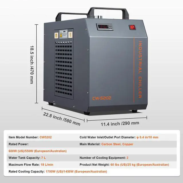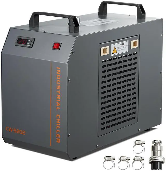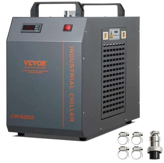 VEVOR Industrial Water Chiller, CW-5202, Industrial Water Cooler Cooling System with Built-in Compressor 7L Water Tank Capacity 18 L/min Max Flow Rate, for CO2 Laser Engraving Machine Cooling Machine Unparalleled Cooling Performance Powerful Water Pump Visual Water Level Triple Protection Thoughtful Accessories Metal Casing Rated Cooling Capacity: 1700W, Water