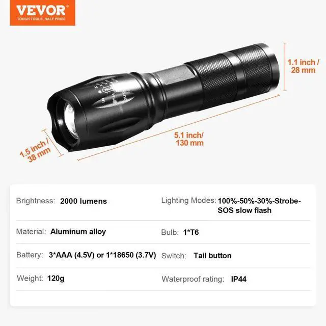 Lighting Modes: 100%-50%-30%-Strobe-SOS slow flash, Switch: Tail button, Brightness: 2000 lumens, Bulb: 1*T6, Battery: 3*AAA ( 4.5V ) or 1*18650 ( 3.7V ), Material: Aluminum alloy, Weight: 120g,