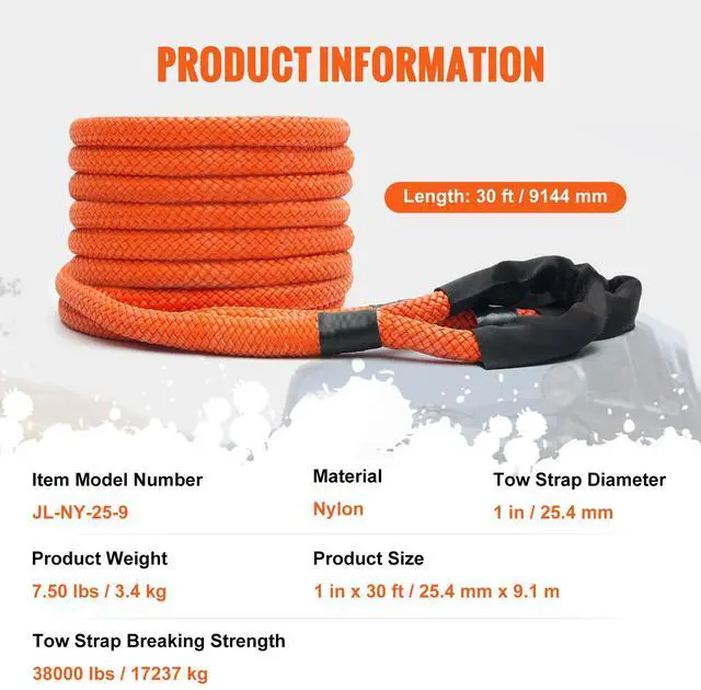 VEVOR 1" x 30' Kinetic Recovery Tow Rope 38, 000 lbs, Heavy-Duty Off Road Snatch Strap, Extreme Duty 30% Elasticity Energy Snatch Strap for Jeep Car Truck ATV UTV SUV Tractor High Strength Reinforced