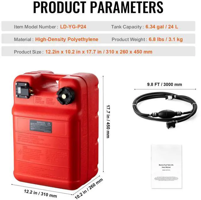 VEVOR Marine Fuel Tank, 6.34 Gallon/24L, Portable Boat Fuel Gas Tank for Outboard Engine Boats, Plastic Outboard Marine Boat Fuel Tank with Hose, Easy to Carry for Yacht, Fishing Boat, Deck Boat, Red Marine Fuel Tank Secure Sealing Strong Compatibility Easy Setup and Use Portable Storage Wide