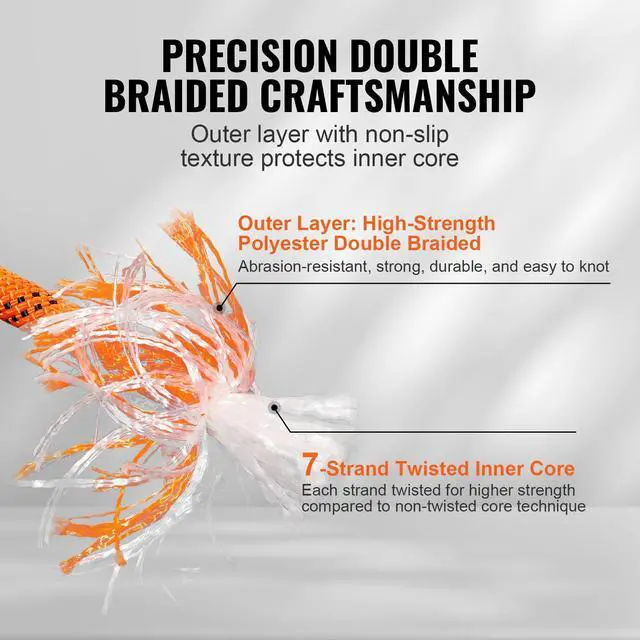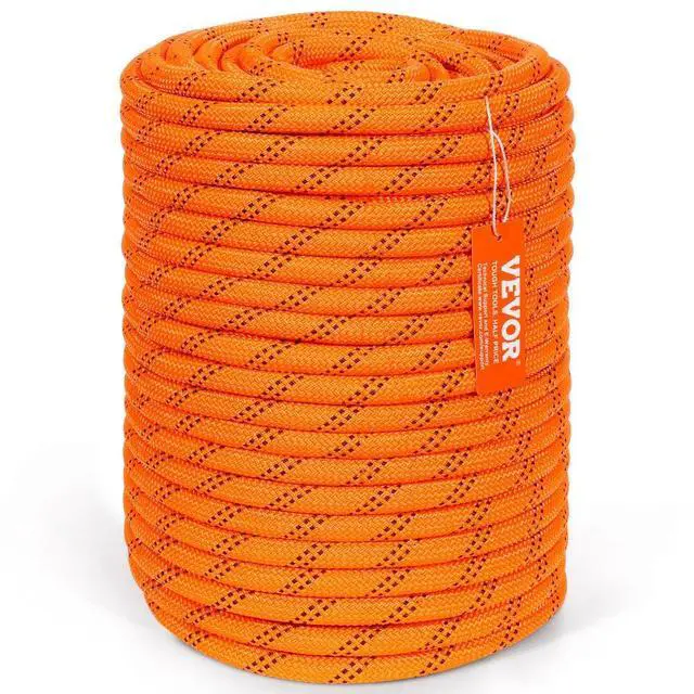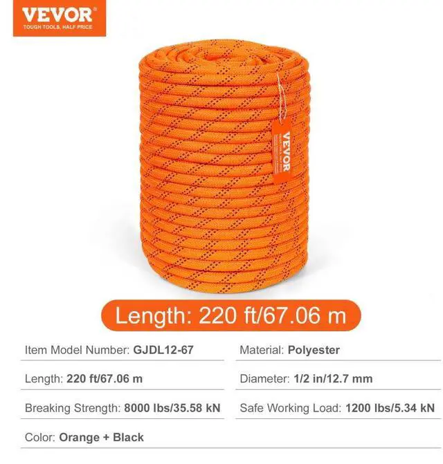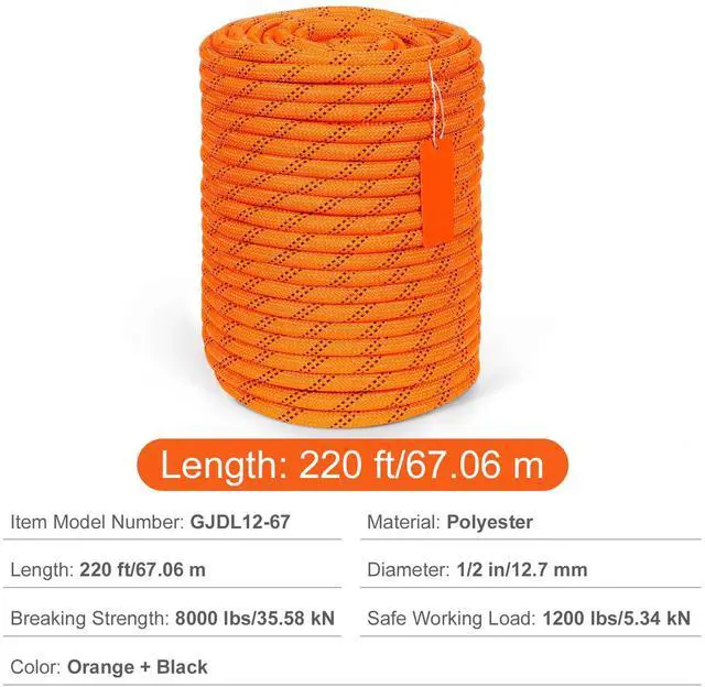 VEVOR Double Braided Polyester Rope, 1/2 in x 220 ft, 48 Strands, 8000 LBS Breaking Strength Outdoor Climbing Rope, Arborist Rigging Rope for Rock Hiking Camping Swing Rappelling Rescue, Orange/Black Versatile Synthetic Rope Tough and Reliable Design Extended Length for Convenience Strong and Sturdy Build Secure and Safe Finish Quality Material for