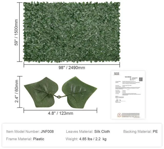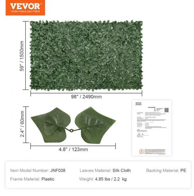 • VEVOR Ivy Privacy Fence, 59 x 98 in Artificial Green Wall Screen, Greenery Ivy Fence with Mesh Cloth Backing and Strengthened Joint, Faux Hedges Vine Leaf Decoration for Outdoor Garden, Yard, Balcony