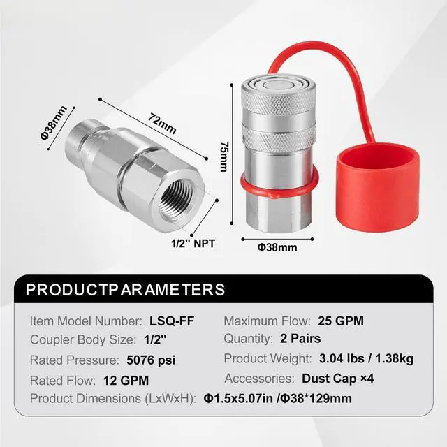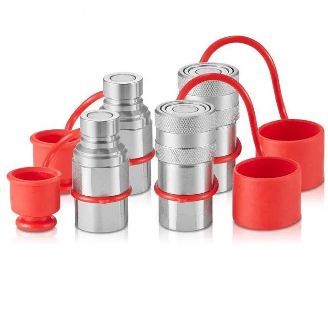 1/2" Flat Face Hydraulic Couplers, 1/2" NPT Skid Steer Hydraulic Quick Connect Couplers with 4 Dust Caps (ISO16028)