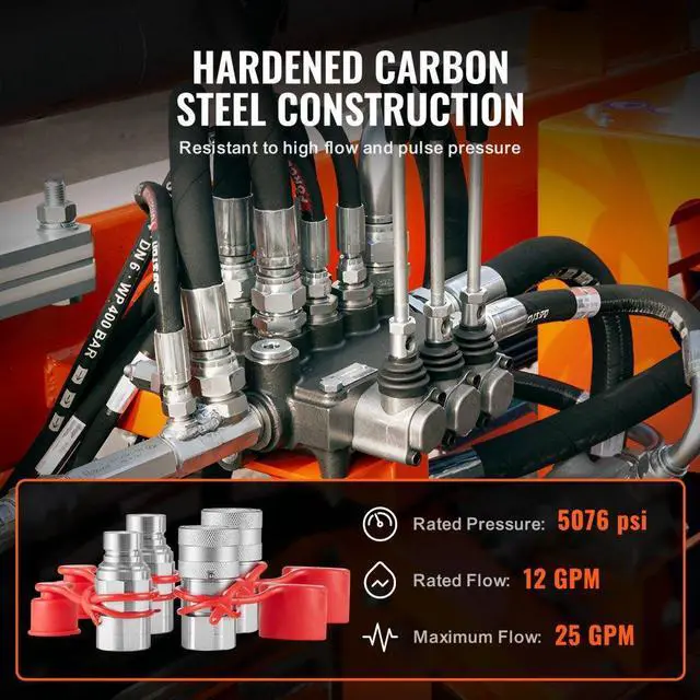 • Hardened Steel Construction: The hydraulic quick connect couplers is constructed from hardened carbon steel, rated for pressures up to 5076 PSI and a high flow rate of 25 GPM, capable of withstanding high flow rates and pulse pressures, ensuring durability for years of continuous use.