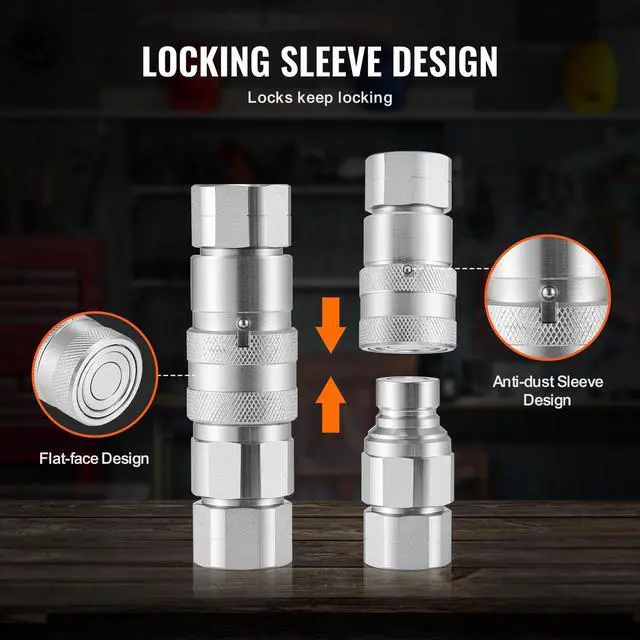 • Sleeve Locking Design: The flat face hydraulic couplers employs a sleeve locking design, allowing for easy connection with just a simple push. The flat-faced design of the coupler facilitates easy cleaning and prevents dust from entering the hydraulic system during connection and disconnection.