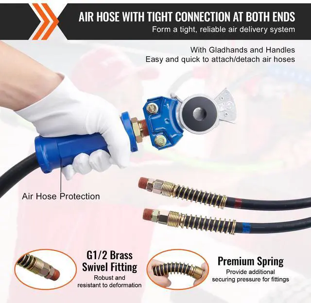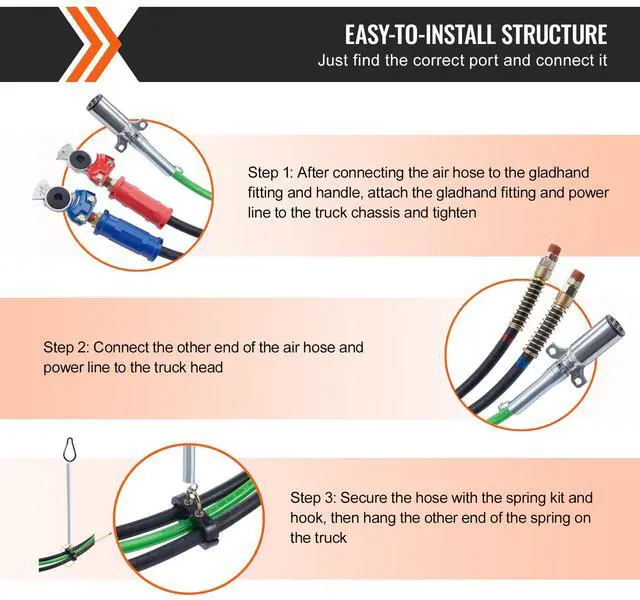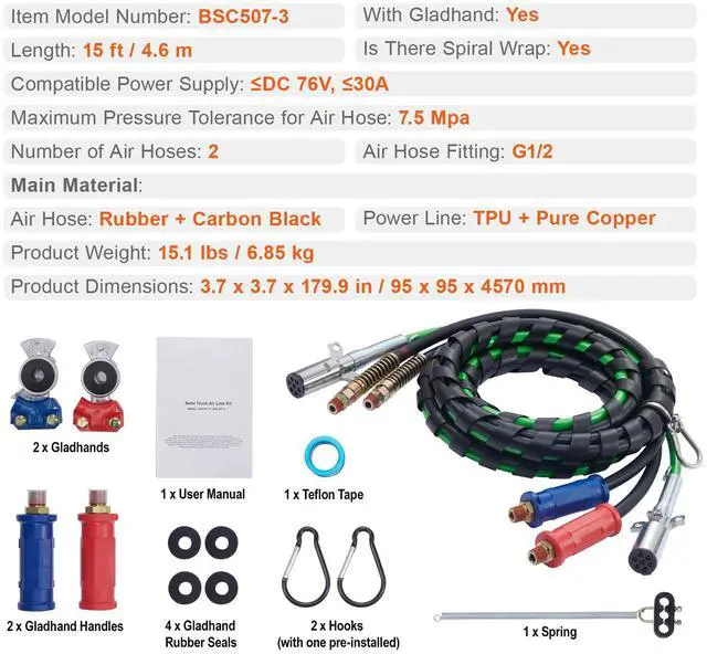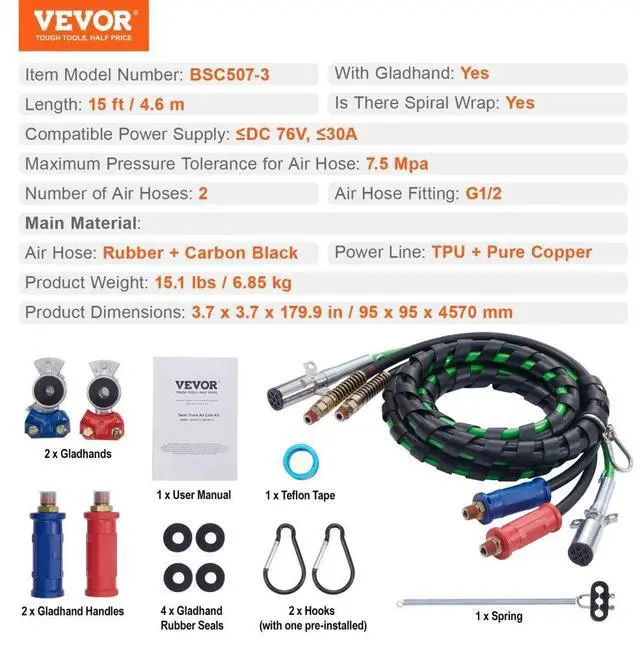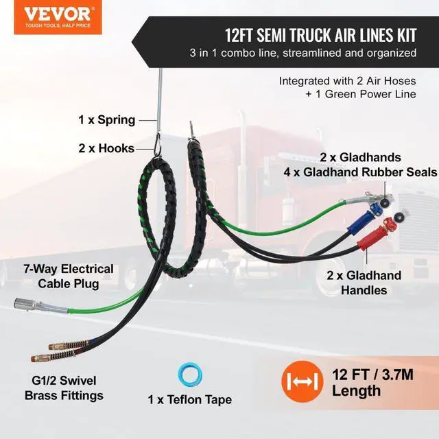 VEVOR 15FT Semi Truck Air Lines Kit with 2PCS Glad Hands, 3-in-1 Air Hoses & 7 Way ABS Electric Power Line, with 2PCS Gladhand Handles, 4PCS Seals and Tender Spring Kit for Semi Truck Trailer Tractor Seamless Air Transmission Pipeline 7-Way Pure-Copper Power Line Serve For Longer Safe Service Life Simple Design, Easy Installation High Quality 3 in 1 Combo Line