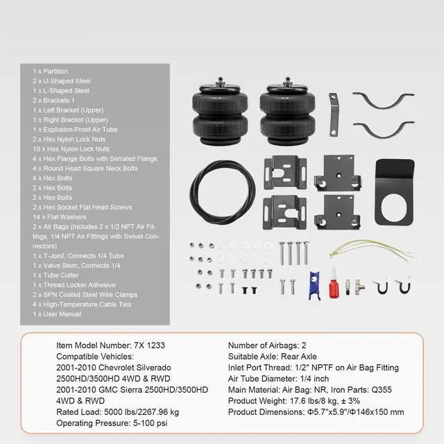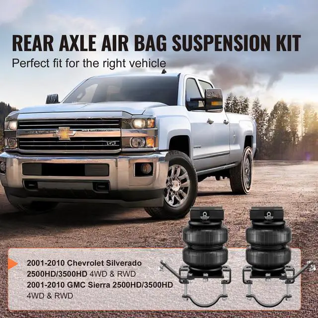 VEVOR Air Bag Suspension Kit, Air Springs Suspension Bag Kit Compatible with 2001-2010 Chevrolet Silverado 2500/3500HD and GMC Sierra 2500/3500HD 4WD RWD, 5000 lbs Loading, 5 to 100 PSI VEVOR Air Bag Suspension Kit Relieve Leaf Springs Durable and Leak-Proof Smooth and Safe Driving No Drilling Required
