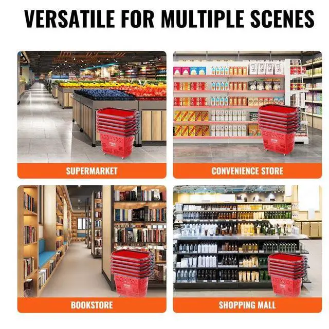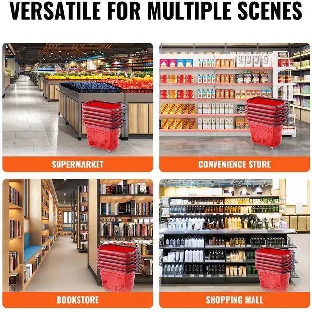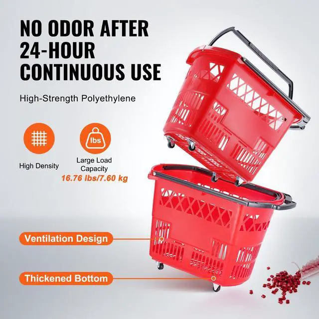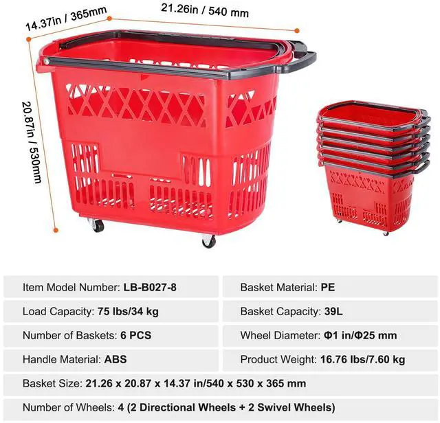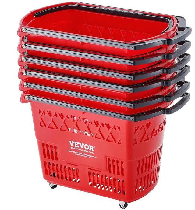 VEVOR Plastic Rolling Shopping Trolley Basket On Wheels 6PCS 39L with Handle Red Generous Capacity Industrial-Grade PE Material Easy on You Convenient Design Versatile and Reliable Grab and Go