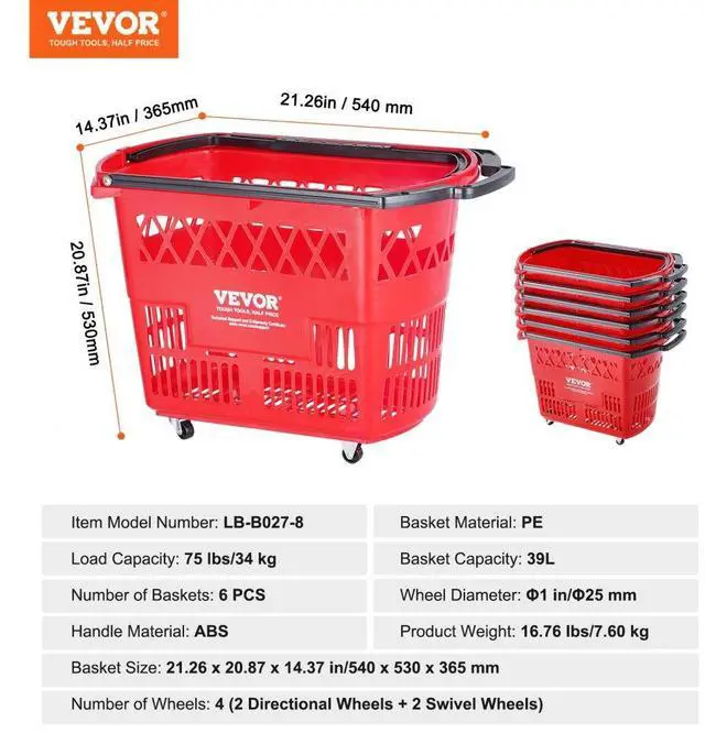 • VEVOR Plastic Rolling Shopping Trolley Basket On Wheels 6PCS 39L with Handle Red