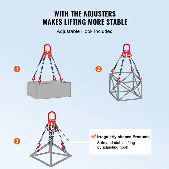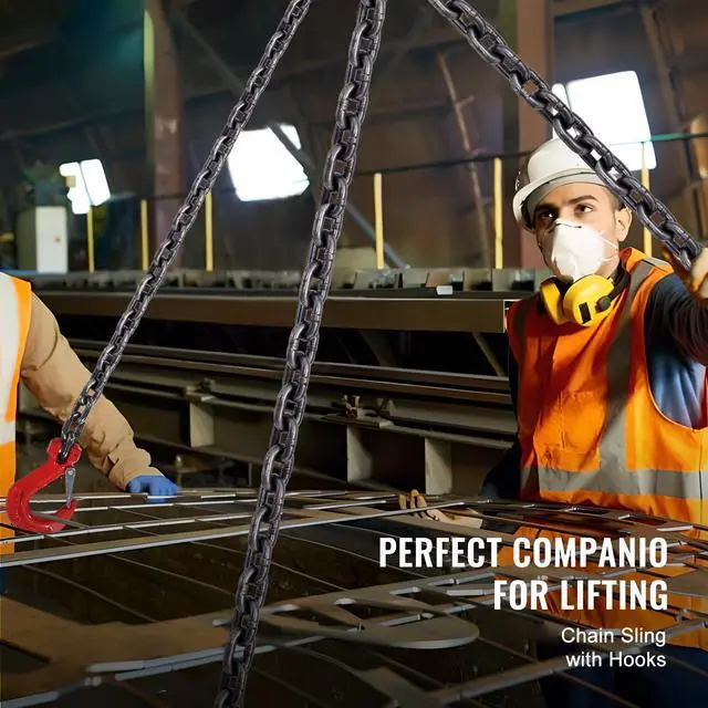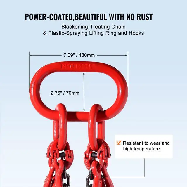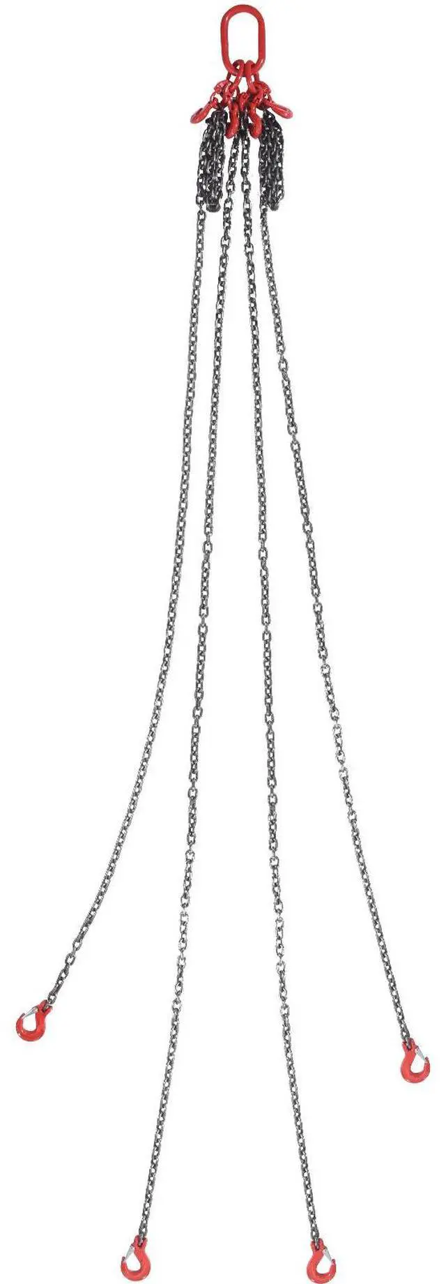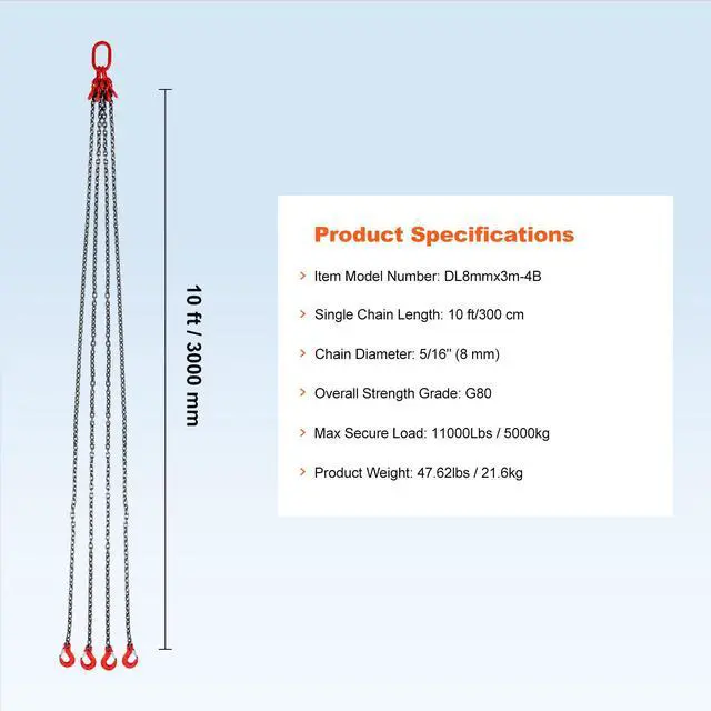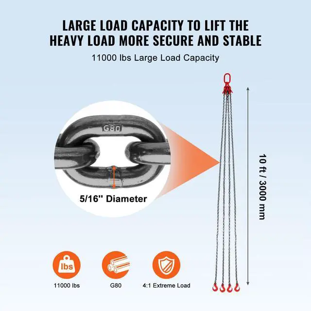 VEVOR 5/16" x 10' Chain Sling 4 Legs G80 Lifting Chain with Grab Hooks 11000 lbs G80 Chain Critical Coating Adjustable Hook Wide Applications Designed with You in Mind Secure Hook Design Single Chain Length: 10 ft/300 cm, Item